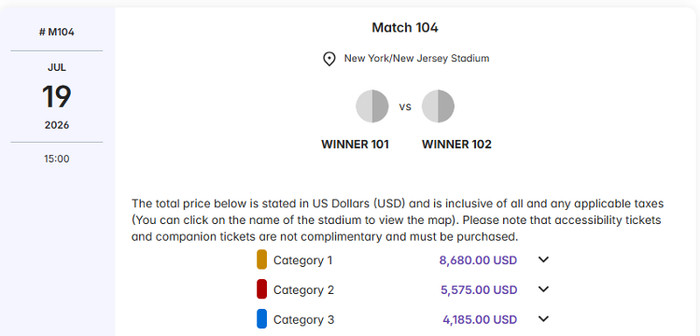 比赛门票价格因场次、比赛地点和参赛队伍而异。对于当地球迷来说,美国队第一场小组赛(在洛杉矶对阵巴拉圭队),最便宜门票的定价为1120美元(约合7901元人民币)。